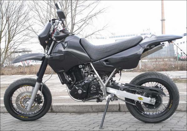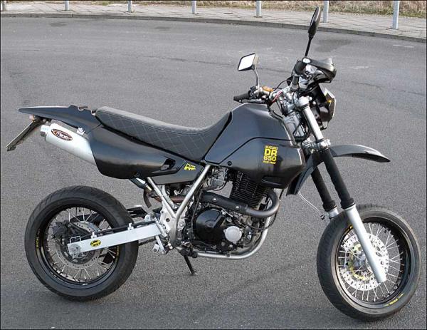 Im Rahmen der Motorüberholung hab ich die DR ein wenig meinem Gusto angepasst! Der Rahmen wurde gestrahlt und dann mit 2k Lack lackiert. Der Motor hat jetzt ´nen Schmiedekolben, glatte Kanäle, ist natürlich frisch gehont, Nocken Stufe1 (Hessler), rein das Zeug durch TM40, raus durch Holeshot und MSR! Zu den Pucky-Räder muss ich nichts sagen ... Â… am Vorderrad bremst jetzt ´ne schwimmende Scheibe. Der Lenker ist ein Magura MX2, die Kupplung wird hydraulisch mit ´ner Magura Hymec betätigt. ACERBIS Handguards mit Alu-Schiene warten auf vorwitzig abstehende Autospiegel Â…