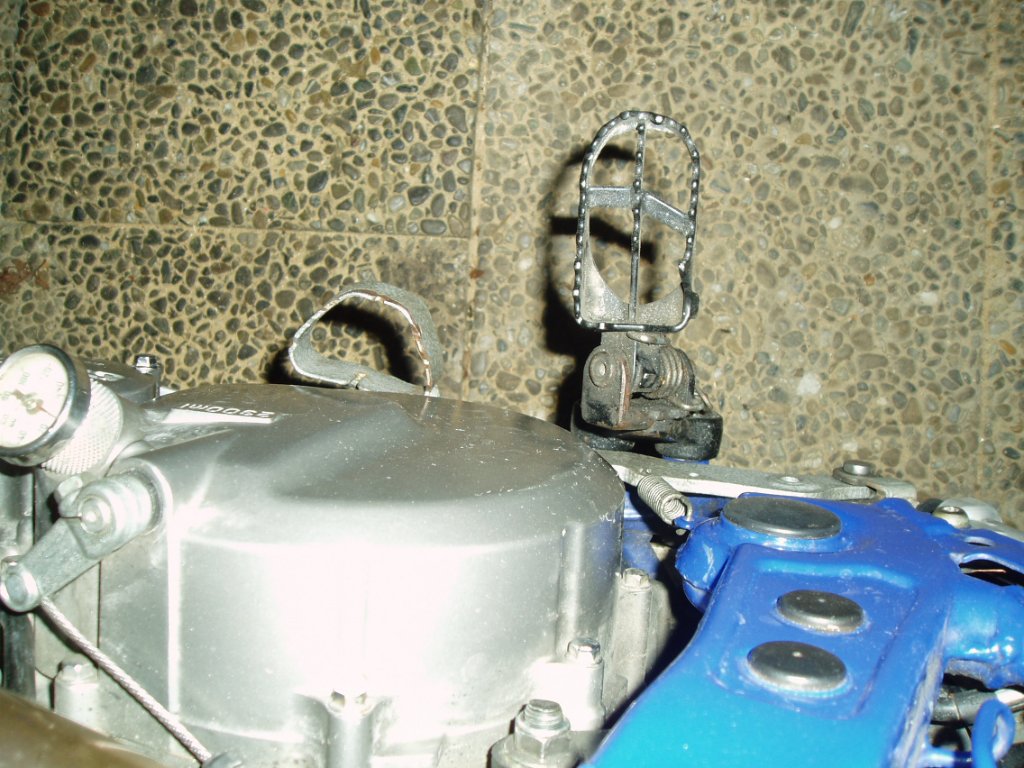 Hi,also ich hab das so gelöst :Die Rasten sind gebraucht von einer Yamaha WR/YZ ,mit kleinen Änderungen angepasst und die Auflage für den Bremshebel aus einem Blech gebogen und angeschweißt....