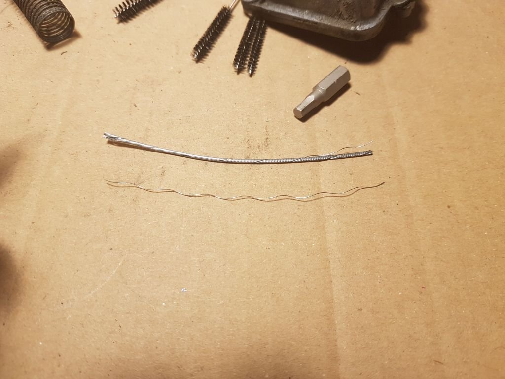 Weil aber auch die schmalsten Bürsten/Drahtspiralen manchmal zu dick sind hab ich was anderes gebraucht. Ich hab für den Zweck schon Akkupunkturnadeln eingesetzt, gibt’s in der Apotheke oder online. Weil ich aber im Herzen Schwabe bin und immer auf der Suche nach Sparmöglichkeiten. Daher habe ich einen alten Bowdenzug gefleddert. Damit kommt man tatsächlich auch durch die kleinsten Öffnungen.