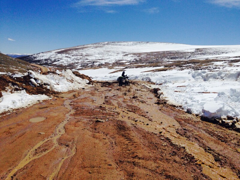 Am ersten Tag haben wir es bis Ölgii geschafft. Wir haben gemerkt dass wir ca. einen Monat zu früh dran sind, es war sehr kalt. Die Strecke von Ölgii nach Khovd führt über einen 2700m hohen Pass, wir hatten Pech, es hat ein Schneesturm eingesetzt. Auf dem Pass habe ich einen mongolischen Motorradfahren abgeschleppt. Sein Motor lief nicht mehr und er hatte keine Bremsen. Darum wollte er nur Berg auf geschoben werden ;). Auf diesen Pass hatte ich einen Sturz, mir ist ein Auto entgegen gekommen und ich bin auf die rechte, Schnee bedeckte Spur ausgewichen. Unter dem Schnee haben sich tiefe Spurrinnen von LKWs verborgen, dort bin ich reingefahren und dann auf die Rechte Seite gestürzt. Ich habe mir wahrscheinlich 2 Rippen geprellt und habe bis heute noch bisschen schmerzen. Bei der DR ist der Kofferträger gebrochen, der Fußbremshebel und der Frontspoiler verbogen. Aber alles halb so wild, was verbogen war habe ich wieder gerade gebogen und der Kofferträger hat mich trotz Bruch durch die ganze Mongolei gebracht :). Jedenfalls war jetzt etwas mehr Respekt da.