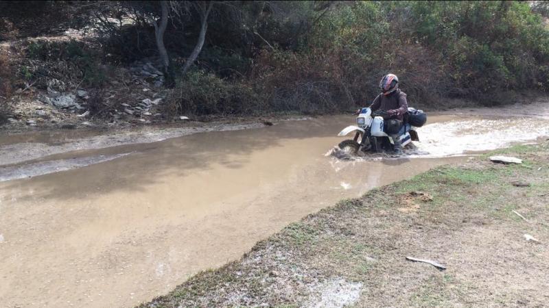 Der erste Einstieg befindet sich an der Nordküste zwischen St. Floraint und Calvi. Anfangs sehr sehr locker zu fahren -Schotter und halbwegs fester Untergrund-. Jedoch bemerken wir schnell, dass die Piste auch steile Passagen und tiefe Wasserbecken enthält –Traum für Endurofahrer. Die ersten Schlammlöcher sind noch ziemlich harmlos, werden jedoch allmählich immer tiefer.