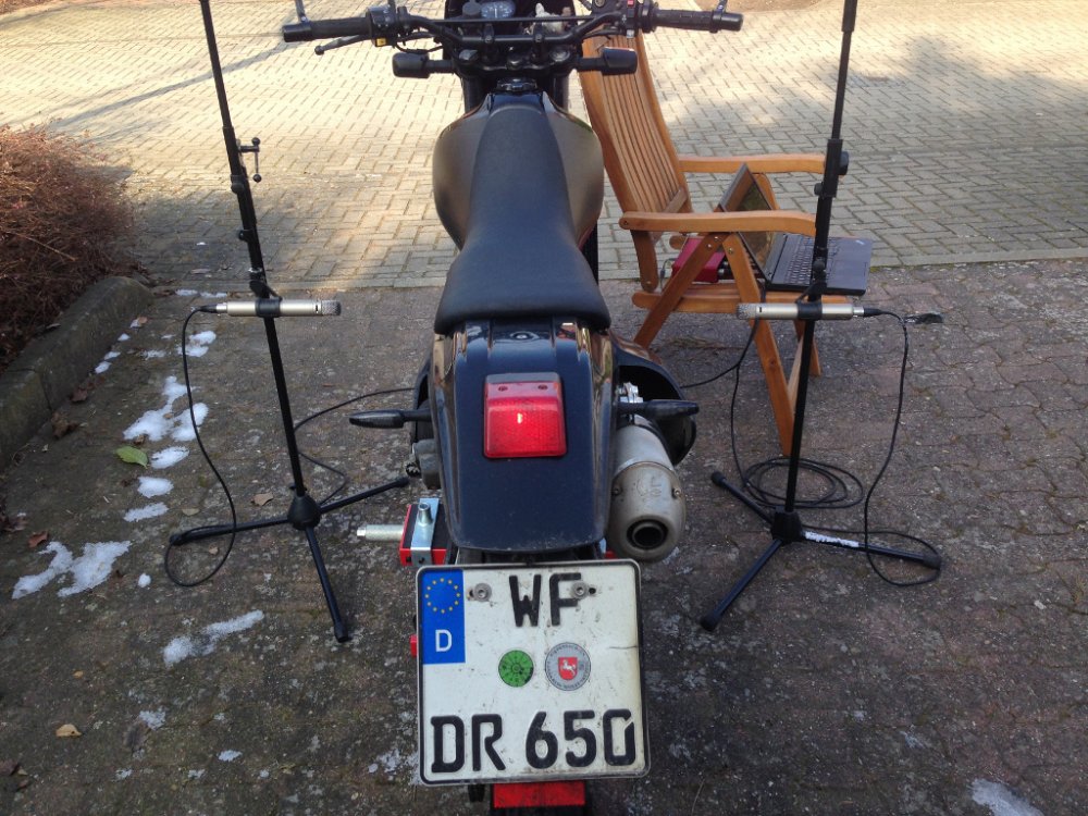 Und damit man sich ein Bild machen kann, wie die Mikros ausgerichtet waren: gleicher Abstand, vertikal knapp über dem Zylinderfuß, horizontal auf die hinteren Kühlrippen des Zylinders, rechts/links wie auf den Bildern.