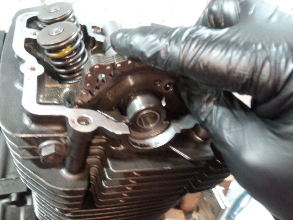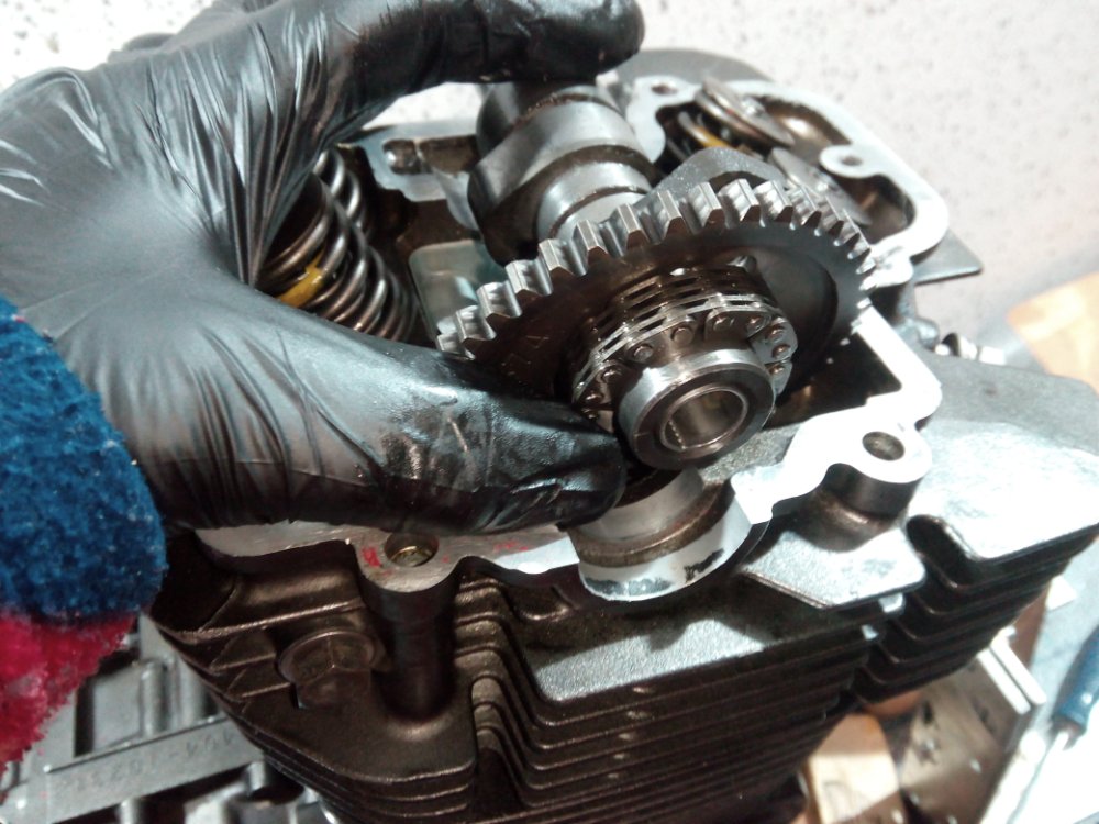 - dann die Nockenwelle in die Nockenwellenlagerung gelegt, Zahnrad und Kette hängen noch lose über der Welle