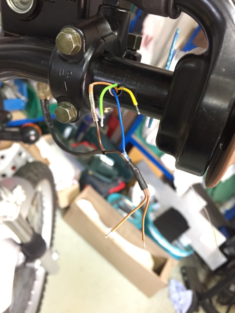 Also 3 Löcher (5mm) in den Lenker gebohrt, eins links, eins rechts und eins zwischen den Lenkerklemmböcken, eine Schnur reingezogen und mit Muttis Häkelnadel an den Löchern rausgefischt. Das war garnicht mal sooo schwierig. Dann aber Kabel und Drähte rein zu fummeln und zu verlöten schon eher.