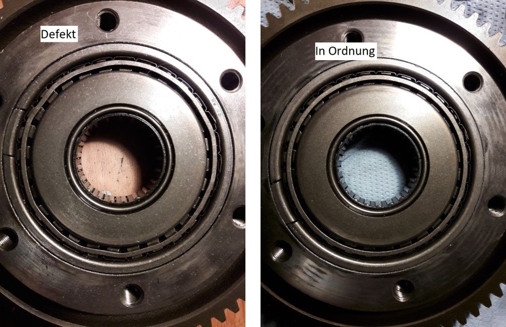 Im direkten Vergleich der Teile fällt die Verformung des Blechkranzes, der die Klinken hält, am defekten Freilauf stark auf.