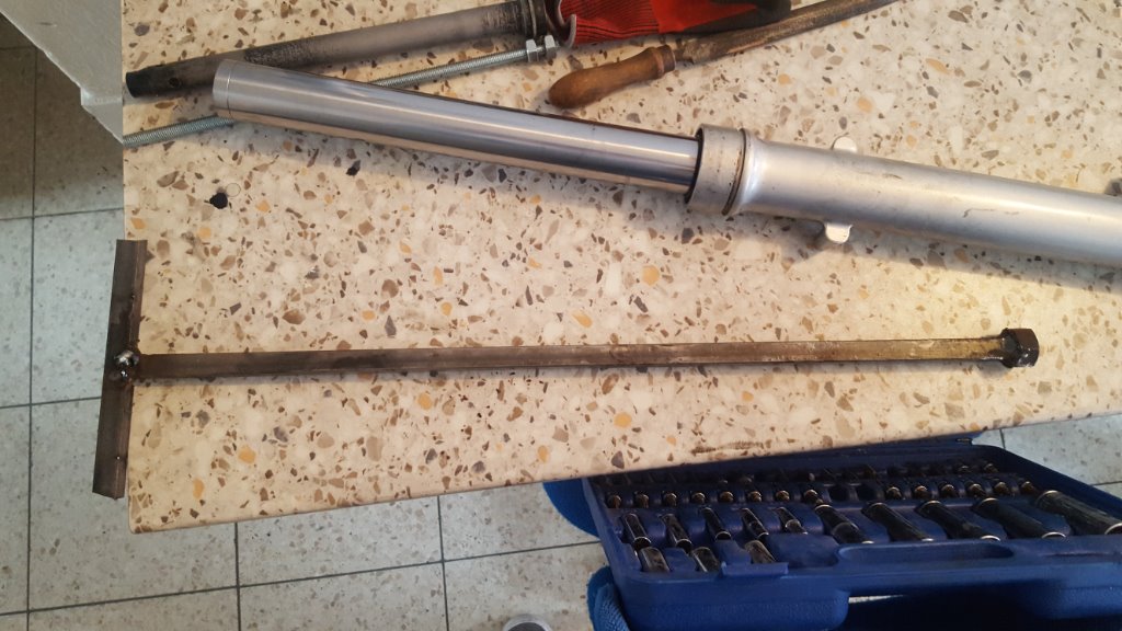 Ein Steckschlüssel 20x22, hier passt die Aussenseite der 22er Weite in die Stange der Gabel. Dann in die 20er Seite einen weiteren Steckschlüssel 16x17. Also 17 in 20.