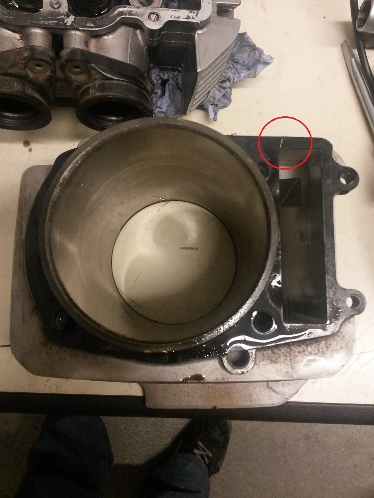 Hier sieht man den Schwachpunkt wo die Papierdichtung nur allzu gerne reißt, meist in der Nähe des Kettenschachts!