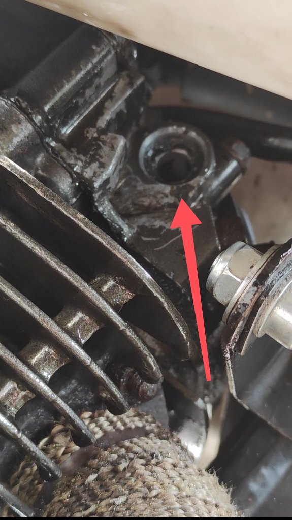 Folgende Fotos sind von der Maschine eines Kollegen. Ich bin leider nicht sehr technikaffin wenn es um Motoren geht. Aber in meinen Augen fehlt nur ein Stopfen und nicht der ganze Kipphebel drinnen. Das Teil ist in den Explosionszeichnungen leider auch nicht zu finden. Sie startet normal, nur es würde direkt das ganze Öl rausdrücken.