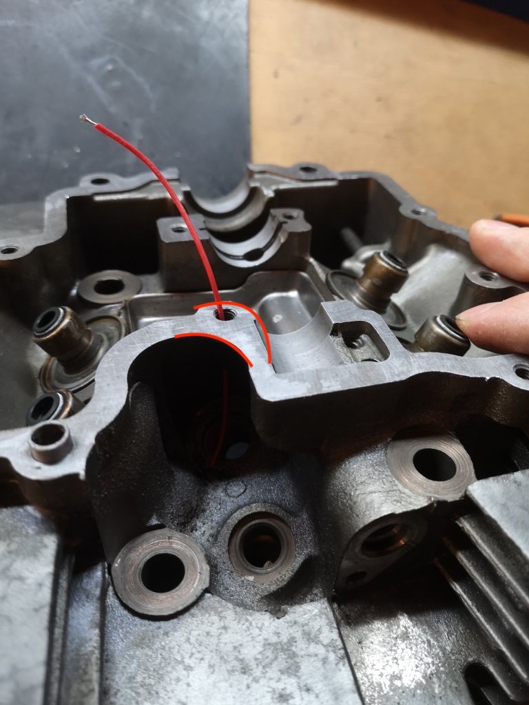Wie bereits weiter oben von mir beschrieben, war es bei mir so, dass das Öl durch das eine Loch von der darüber liegenden Gewindebohrung kam und sich um die Zündkerzen verteilt hat. Es ist nicht an den Kühlrippen nach unten gelaufen sondern durch ein zweites Loch neben der äußeren Zündkerze nach unten gelaufen und hat sich weiter verteilt siehe Fotos.. Ich habe mehrere Tage gesucht bis ich die zwei SCHEI... LÖCHER