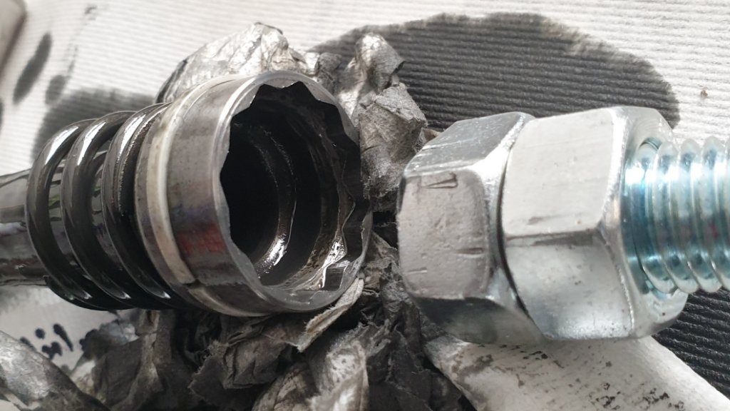 So nun zum Problem. An dem Rad hing noch ne Gabel mit Lenker, Lampe und Lampenmaske dran, nebst Bremsanlage. Das Ganze sollte nicht älter als 6 tkm sein. Da meine Kiste von 94 ist und das Ganze schon 55 tkm gelaufen hat, kam ich auf die Idee, die nun Zweitgabel, zu Überholen und bei Bedarf einfach zu tauschen. Also hab ich mal kurz meinen Blick über das Teil schweifen lassen die Faltenbälge nach unten gedrückt und das Teil mehrmals kräftig eintauchen lassen. Beim Eindrücken der Gabel ( mehrmals ) kam Öl aus den Dichtringen heraus. War zu erwarten. Also oben die Verschraubung ab, Teile raus , Öl raus und uj juj juj, sieht das Sch..... aus. Federring und Distanzscheibe raus und und jetzt brauche ich guten Rat, denn die Inbusschraube unten ist gekontert .
