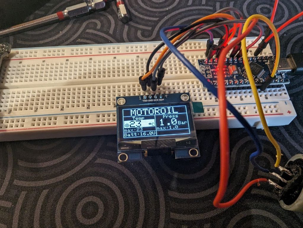 Der HELLA sensor misst absoluten Druck, also sollte das .5bar cutoff kein Problem sein, 0bar Öldruck sind ja 1bar Absolutdruck. Hatte eine kleine Mailunterhaltung mit Wolfgang von Tigerparts, ich werde mir mal ein Paar von den M14 Adaptern bestellen und schauen, wie ich die mit dem m12er Sensor verbinden kann^^. Der Code zum Auslesen vom Sensor sollte auch echt simpel sein, das ganze läuft über ein gut dokumentiertes 5V PWM "Protokoll". Dann noch n kleines Schutzblech gebastelt und ich hab Öldruck und Temperatur mit einem Abnahmeort 8)