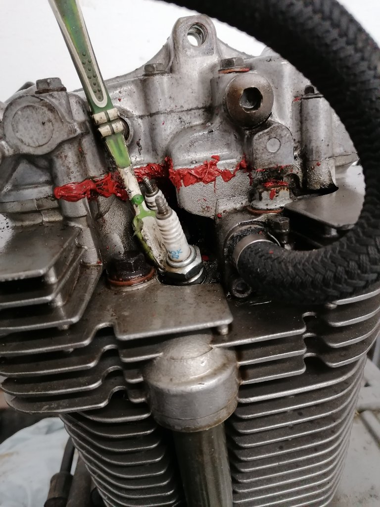 Das rote Dirko am Zylinderkopf ist, so scheints, von aussen aufgetragen. Die schwarze Dichtmasse am Kupplungsdeckel ist wohl auch von aussen aufgetragen.