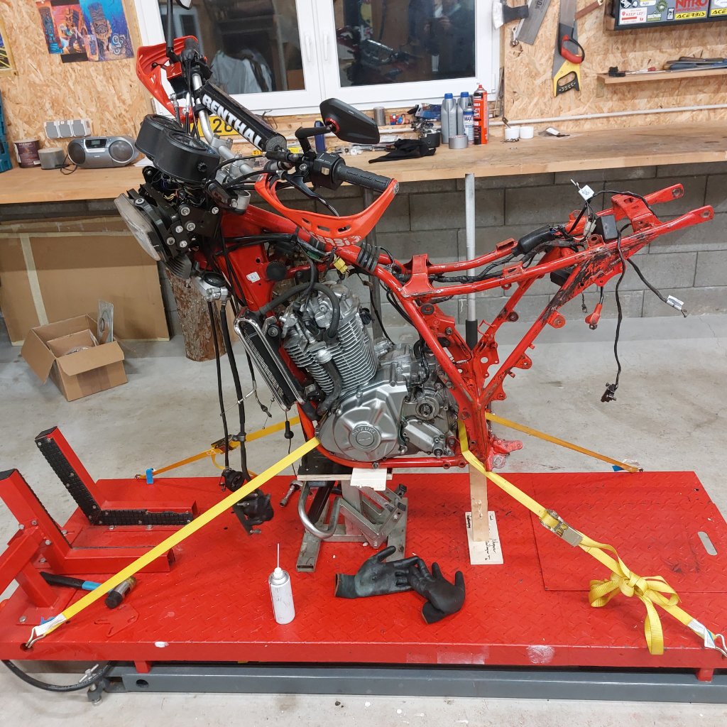 So, die DR steht jetzt nur noch als Rahmen mit Motor hier.