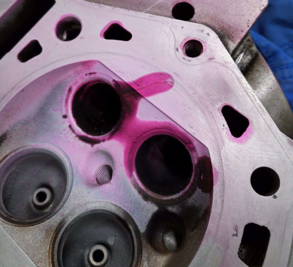 Der Riss ist jetzt vollständig ausgefräst, er ging durch den Öl-Kühlkanal bis tief in den Auslasskanal.