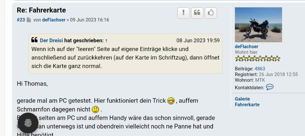 Hi Thomas,Der Dreisi hat geschrieben: 08 Jun 2023 19:59 Wenn ich auf der "leeren" Seite auf eigene Einträge klicke und anschließend auf zurückkehren (auf der Karte im Schriftzug), dann öffnet sich die Karte ganz normal.