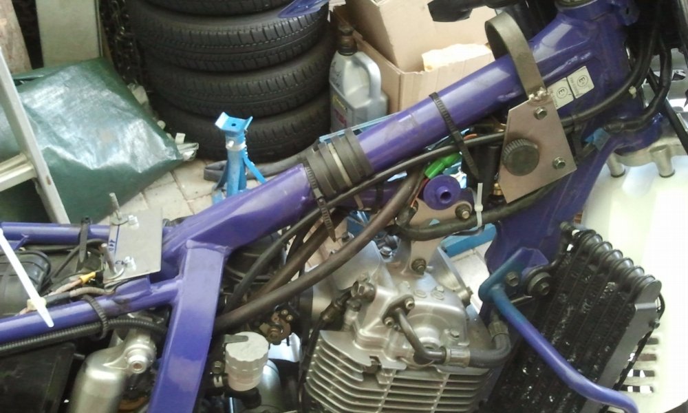 Besonderheit ist, dass eine Tankhalterung angefertigt werden muß, da der Rahmen der DR 600 oder 650 Dakar eine andere Geometrie hat. Das Rahmenrohr steht steiler und damit an der SE der Ölkühler unverändert am Platz bleiben kann muß die Unterkante des Tanks deshalb vorn etwas „angehoben“ werden.