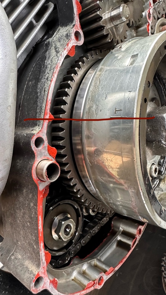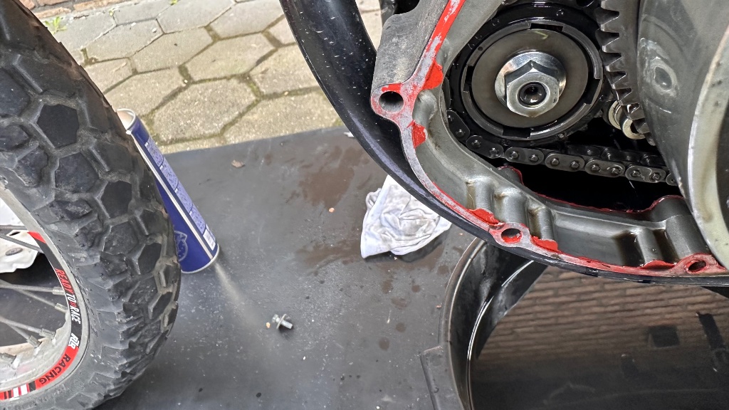 Nun hatte ich vor einen Ölwechsel zu machen und bei der Gelegenheit die Ausgleichskette zu spannen. Bei letzterem hatte ich dann doch arge Probleme. Beim Ölwechsel hatte ich mich schon gewundert, dass ich rote Stückchen im Ölsieb gefunden habe und hatte schon eine Vorahnung auf Flüssigabdichtung. Die habe ich dann auf der anderen Seite des Motors auch gefunden.