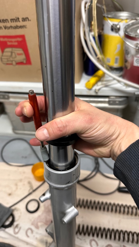 Es ging schon gut los beim Ausbau. Der Vorbesitzer hat die Gabelbrücke innen lackiert, was dazu führte das die Gabelholme erst nicht rauskamen, da sie an der Farbe festhingen und dann die Farbe am Holm festpappte. Schönen Dank auch.