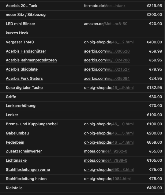 Sitzbank, USB Dose, gaw simmerring sichern, bremsen auf freigängigkeit testen, Neutralschalter, wobei meine immer fest waren, anlasserfreilauf, luftfilter sauber machen, Lager checken und fetten ggf erneuern, acerbis motorschutz, fussrasten tiefer legen, Brems und kupplungsarmarturen so locker dass sie sich verdrehen können, hebel sollbruchstelle bohren, die acerbis Rahmenschützer sind gut, aber mach ein paar geriffelte gummies mit riffelung zum Rahmen dazwischen damit Wasser ablaufen kann und der Schützer nicht den Rahmen scheuert, alle Kontakte mal mit kontaktspray frisch machen, Ersatzkerze mitnehmen damit hast genug zu tun und du wirst trotz viel teurer umbauten aus der dr nichts anderen als eine dr machen.
