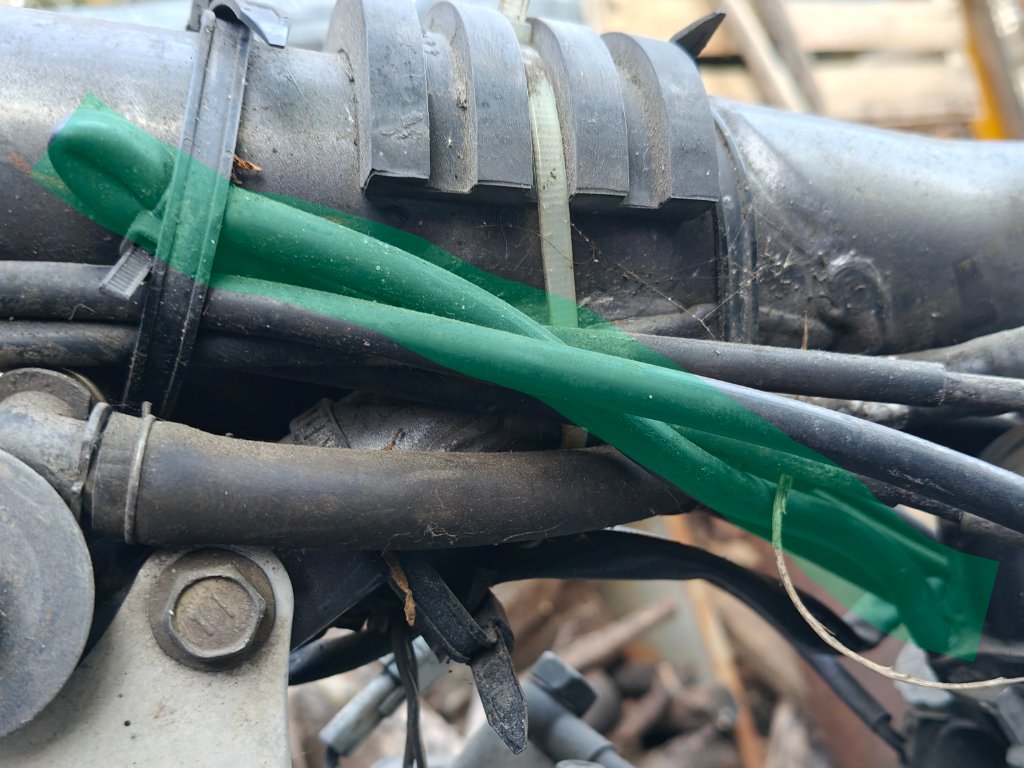 Der Unterdruckschlauch des Scottoilers ist am Vergaser über ein T-Stück angeschlossen, hier grün umkreist. Das Endstück, in Blau, ist geschlossen. Der Schlauches ist direkt am Vergaser am Anschluss Tank Unterdruckschlauch an der roten umkreisung angeschlossen. Der geht bei mir nicht an den Tank, da ich einen 20l Acerbis verbaut habe. Der Benzinhahn hat nur einen Anschluss.