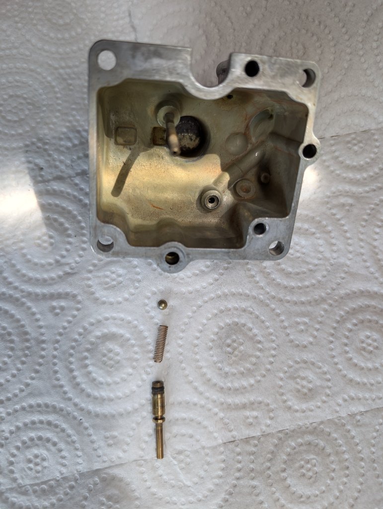 Ab da wird's aber leider dann schwieriger. Habe den Vergaser recht problemlos ausbauen können und die Schwimmerkammer geöffnet: Ihr hattet recht. Sowohl der Kolben als auch die Feder (3) fehlen. Was mich etwas verwundert ist allerdings, dass die Nadel nach der Reinigung jetzt von selbst wieder hochkommt, ohne, dass unten etwas verbaut ist.