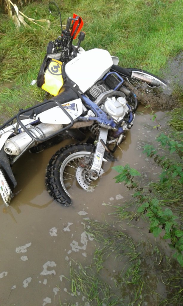 Anscheinend ist dein Seitenständer zu kurz. Sie scheint im Graben einzusinken. Ich würde versuchen, was unter zu legen oder halt das Möp auf festerem Grund abzustellen.