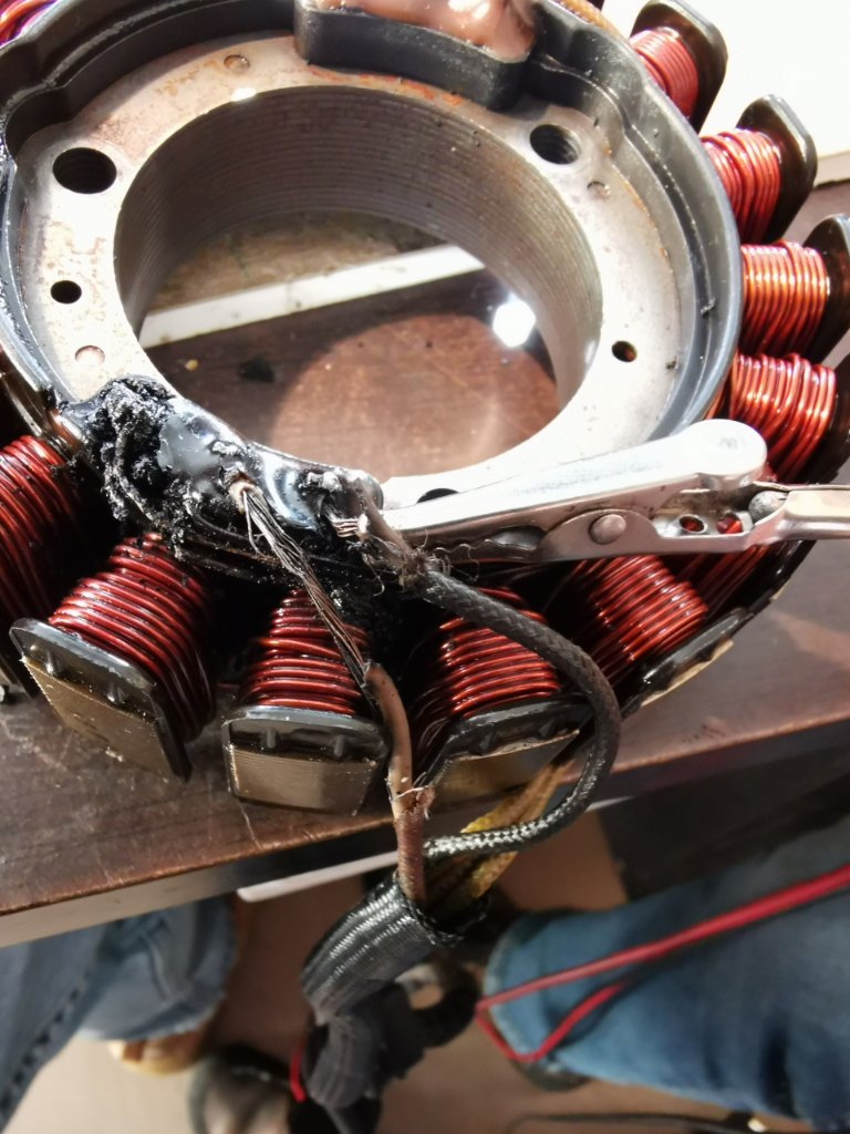 Der abgerauchte Lötstutzpunkt hat ebenso 3 Anschlüsse. Wie sich nun herausgestellt hat, waren auf dem linken Anschluss die 3 Phasen der Ladewicklungen zusammengeführt. Auf dem mittleren und dem rechten Anschluss lag die sogenannte Erzeugerwicklung zusammen mit den Anschlüssen die zur CDI führen. Auch die haben sich ihrer Hülle entledigt.