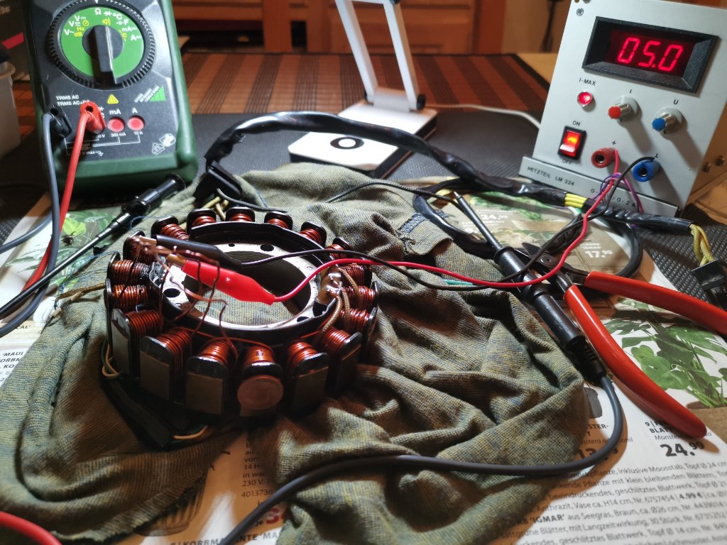 Hier sieht man schön die drei Spulendrähte die zusammengefasst waren, nun erst mal zum Messen verdrillt. Die linken beiden sind die Anschlüsse der Erzeugerwicklung. Hier müssen die Anschlusskabel wieder dran.
