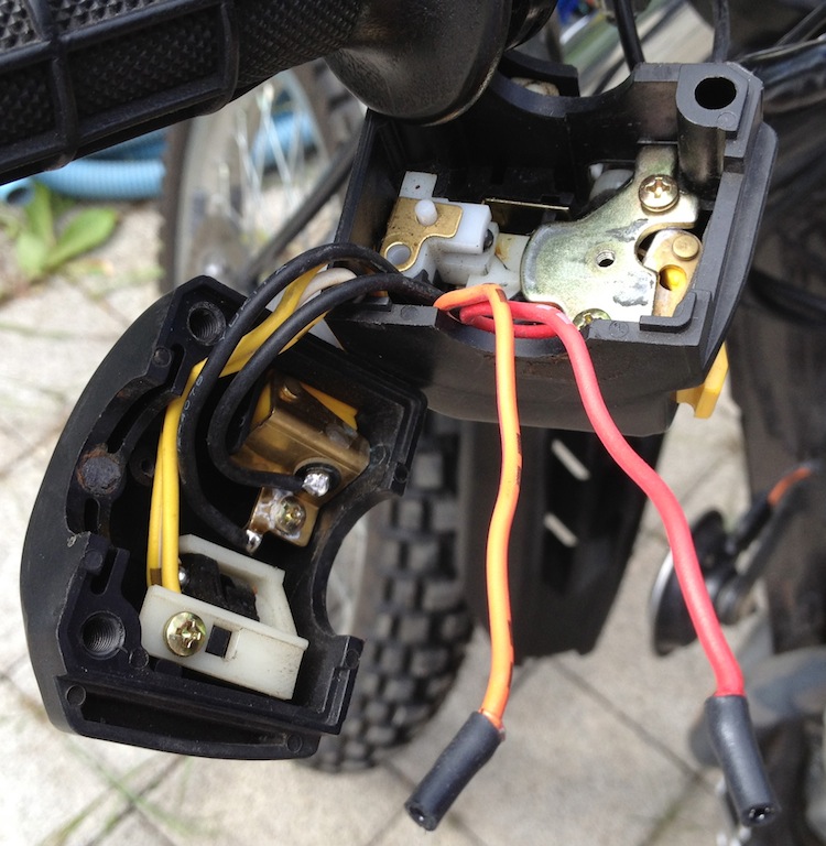 Das rote und das rot-orange Kabel, die ursprünglich am Taster angelötet waren, habe ich entfernt und mit etwas Schlumpfschlauch an den ungekürzten Enden isoliert (braucht man ja vielleicht doch irgendwann noch mal...). Am Hupentaster liegt die erforderliche Masse an (schwarz-weisses Kabel), an den Kontakt habe ich einfach ein kurzes Stück Kabel (schwarz) angelötet und dieses in die Oberschale geführt. Das zweite schwarze Kabel habe ich neu verlegt; es geht runter bis hinter den Scheinwerfer, an den Schaltkontakt des Motogadget Mini (die Umschaltung im Menü erfolgt hier mit einem Kontakt gegen Masse). Ein wenig fummelig, die ganzen Kabel wieder ordentlich in die Schalterschalen reinzubekommen, aber es geht!