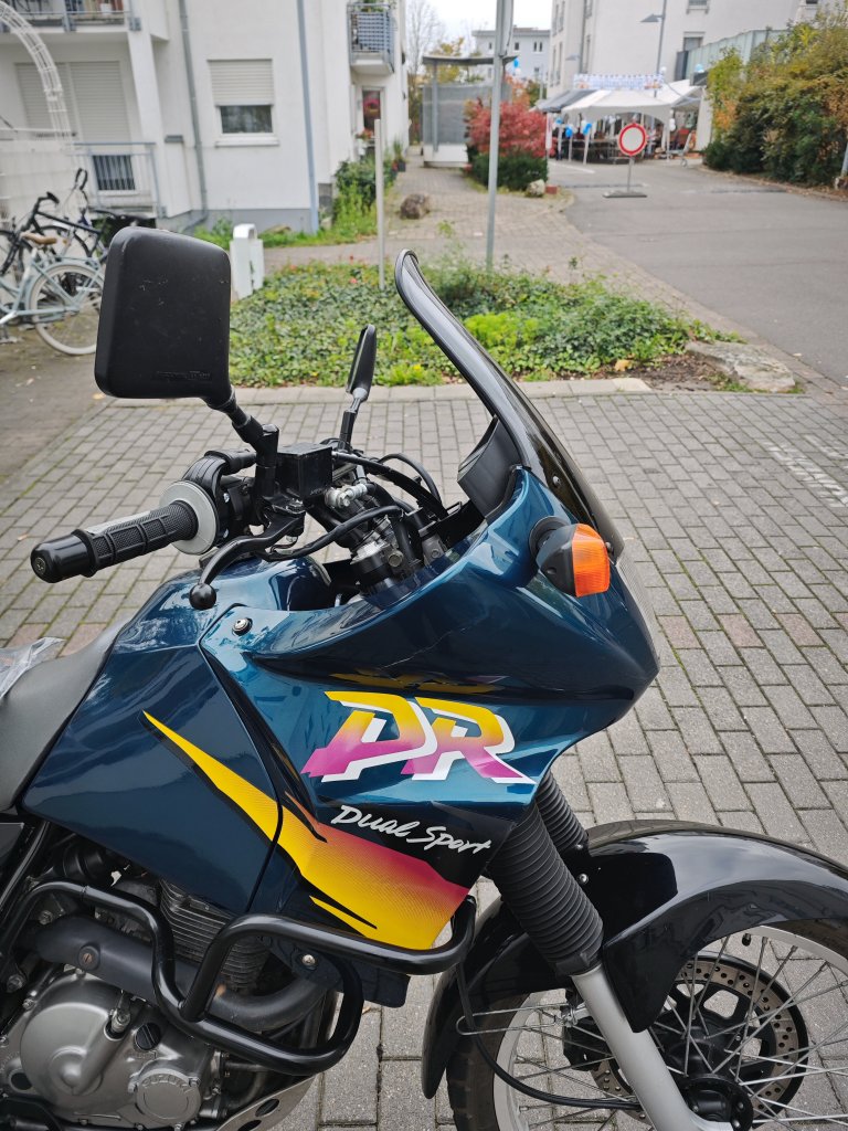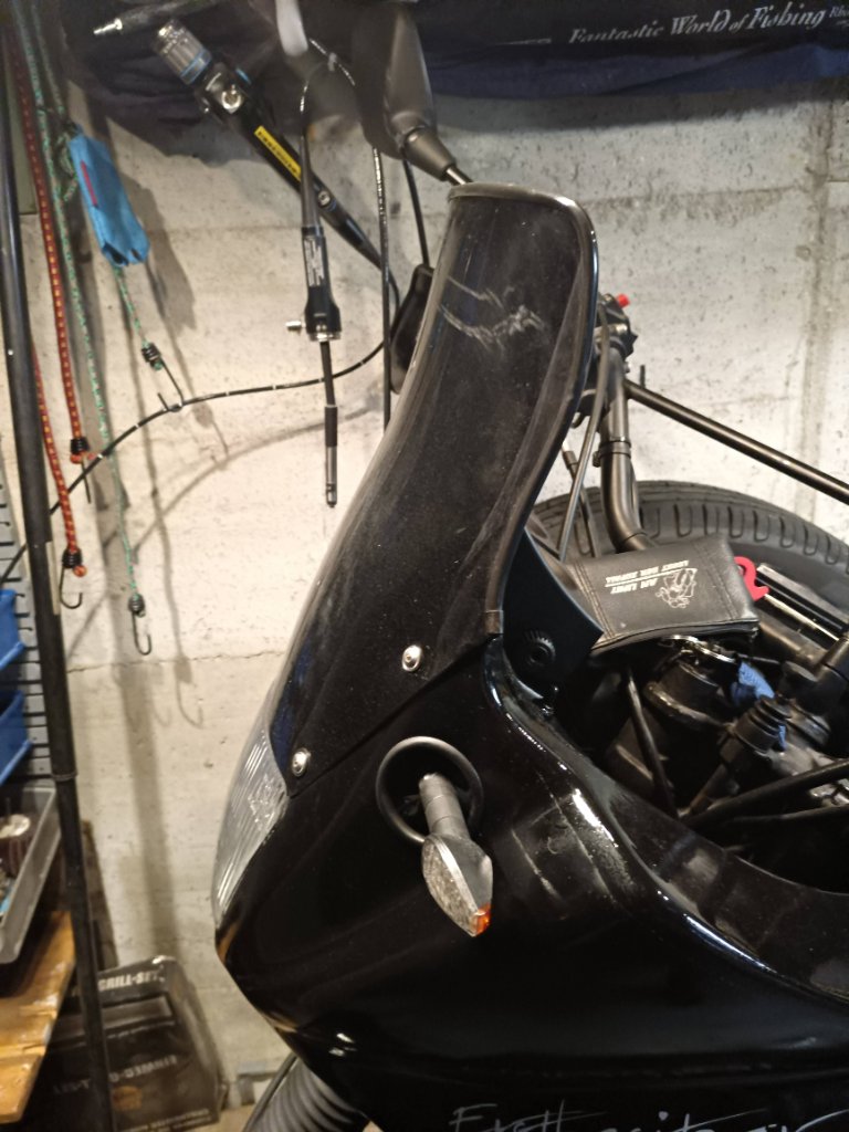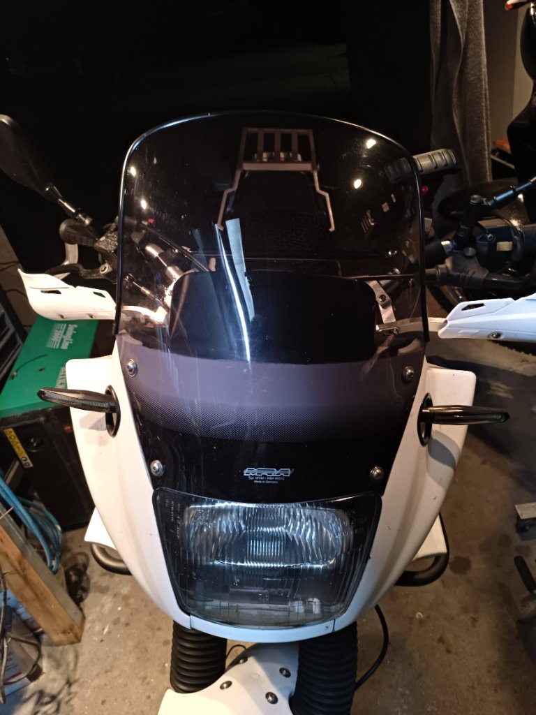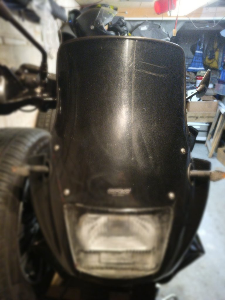 Ich hatte eine alte "Five Stars" Scheibe verbaut, Herkunft unbekannt, aktuell auch nirgends mehr gefunden. Die Scheibe ist 40cm ab Lampenkante und somit 5cm kürzer als die hohe Scheibe die es bei Hessler gibt. Sie folgt der Maske im Winkel nach hinten Richtung Fahrer und hat oben einen kleinen Schwung nach oben.
