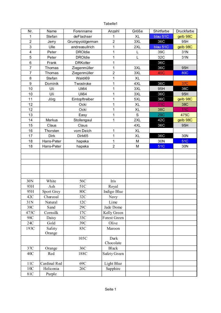 Name Forenname Anzahl Größe Shirtfarbe Druckfarbe