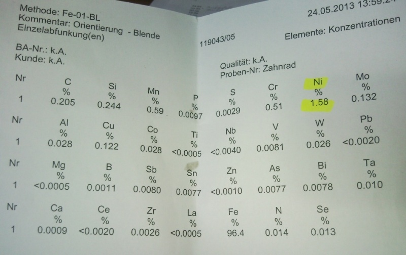 Die beiliegende Spektralanalyse belegt die Eigenschaften eines C20 C-Stahles, der in Deutschland in dieser Qualität mit dem Nickelanteil nicht gebräuchlich ist.(kommt ja auch aus Japan