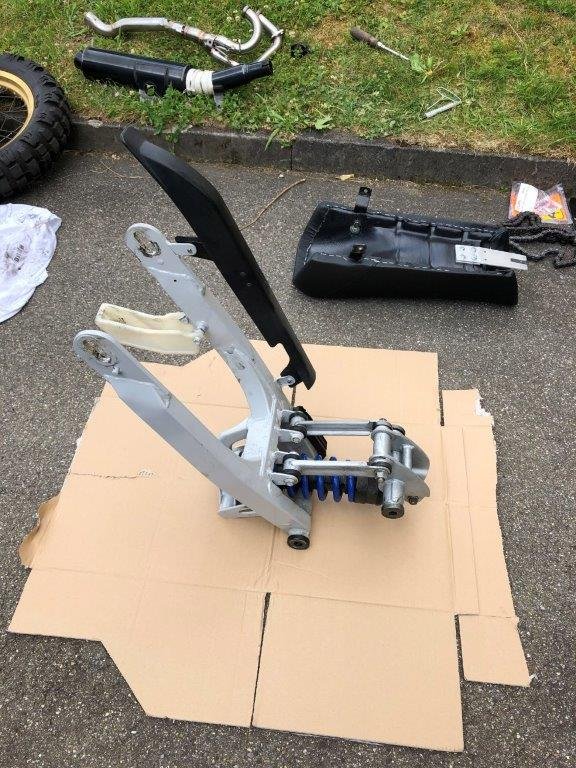 Beide Achsen gezogen und schon liegt die ganze Schwinge mit Federung da. Das Federbein ist nicht unter Spannung und kann dann sehr einfach und schnell gewechselt werden.