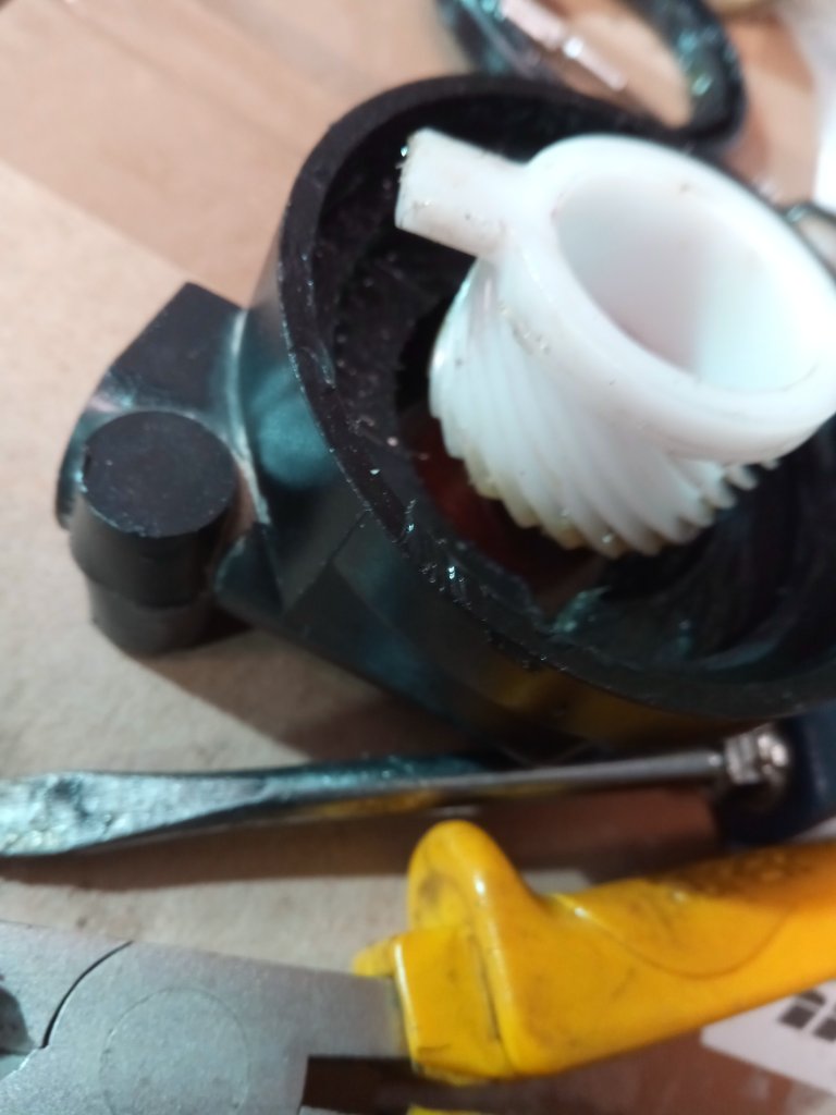 Am Gehäuse ist ein Stückchen abgeplatzt, das sollte aber nichts ausmachen. Bekommt man die Metallschnecke irgendwie aus dem Gehäuse raus, also zerstörungsfrei? Dort wo die Welle eingesteckt wird, ist eine Bezeichnung drauf und es könnte ein Simmering sein, muss aber nicht. Im WHB ist hierüber nichts beschrieben. Will da nicht mit Gewalt rangehen.
