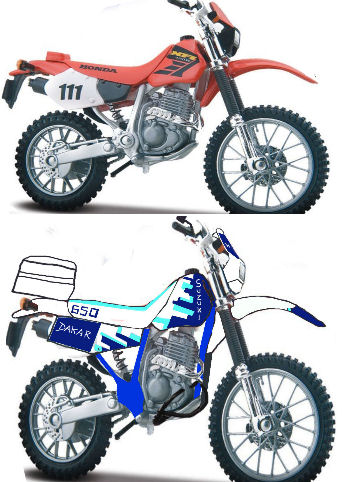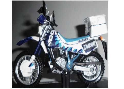 Es gab mal ein Spielzeug-Modell der Dr 350er...aber sehr schwer zu finden...also hab ich mir eine Honda XR 400 R in 1:18 besorgt und werd die etwas umbauen und anmalen in Suzuki Dr 650 Dakar Farben...bin gespannt ob es klappt. Ich hoffe es klappt besser als mit dem DR Big Modell, ich hatte als Vorlage(Ausgangsmotorrad) nur eine alte Harley Stand-Uhr und etwas Lufttrockner Lehm...weil ein Modell in Mini gab es leider von der Dr 750er Big auch ned...aber da würde als Vorlage eine BMW gehen (und dann etwas abändern und lackieren)...weniger Lehm...dann würds besser ausschauen.Aber so ist es Kunst. Vielleicht ist ja einer unter Euch der auch LUST auf so ein Projekt hat?