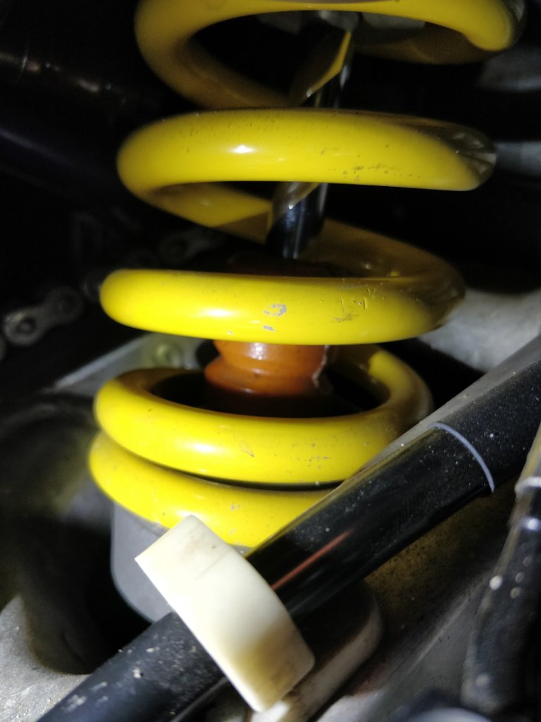 Bevor ich den Gummi herunter gedrückt habe, habe ich einen kleinen Tropfen Sekundenkleber an der Dämpferstange angebracht.Dadurch rutscht der Gummi nicht wieder hoch. Bei meiner SE hatte ich später den Ring weggeschnitten :),dazu muss der Dämpfer zerlegt werden.
