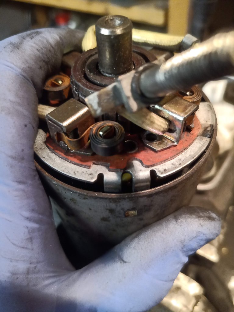 Heute gab es aber noch ein anderes Problem zu lösen. Da meine alte Dame eine SP42B ist kenne ich mich mit der Anlassergeschichte nicht so gut aus. Der erste Fehler wr , dass ich das Zahnrad Nr. 3 mit Achse Nr. 6 verkehrt herum eingebaut habe (https://www.cmsnl.com/suzuki-dr650rse-1 ... IG-06.html). Der Anlasser war montiert, drehte aber nicht. In irgendeinem Beitrag hatte ich von Markus (Stollengaul) gelesen, man solle mal die Gehäuseschrauben in der Nähe des Anlassergetriebes lösen, um zu schauen, ob sich der Anlasser überhaupt dreht. Gesagt, getan. Jawohl er drehte sich. Anschließend das Moped nach dem Stapellauf auf die rechte Seite gelegt und gesehen, dass ich dieses Zahnrad mit Achse falschherum eingebaut hatte. Voll euphorisch alles wieder montiert und den Test gestartet. Nun waren die Gehäuseschrauben wieder fest und der Anlasser drehte, jedoch nicht den Motor. Um Euch nicht zum 500sten Mal mit Anlasserproblemen zu belästigen, habe ich Markus direkt angeschrieben. Dann kam der entscheidene Tip. Bei der Anlasseraufarbeitung meinerseits habe ich nicht darauf geachtet, wie der Magnet zur Gesamtlage eingestzt wird. Klar passt er nur ein eine Richtung, aber es gibt kleine Deteils zu beachten. DIese Platte mit den Kontakten hat 2 kleine Metallaschen und diese müssen mit dem Magneten ausgerichtet werden. Dieser hat dazu auf ser Innenseite einen kleine Nase die von Außen auch zu erkennen ist.