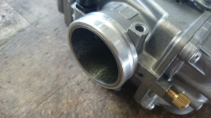 Der Adapter ist vorne bündig mit dem Vergaser. Aber da der Adapter auf der Airboxseite 6mm aufträgt und der TM generell 3mm länger als der BST ist, entstehen 9mm Längendifferenz, die der Gummi zwischen Lufi und Vergaser nicht ausgleichen kann.