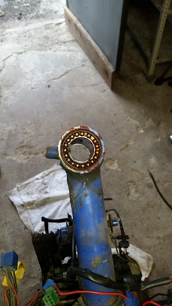 Umbau auf Kegelrollenlager erfordert das Abdrehen des Gabeljochs im Durchmesser im Bereich des oberen Lagers, da das Lager dicker ist und somit weiter runter aufs Joch muss.