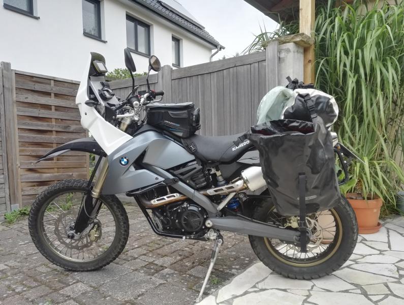 Mit dem X-Tank von Hot Rod Welding geht es so 200 km. Dann leert sich der BMW Tank. Den habe ich bisher noch nicht leergefahren, rechnerisch sollte ich dann so auf 450 - 500 km kommen. Das sollte reichen. Wie sich die Sache dann jedoch auf schlechten Strecken verhält - weiß ich nicht. Denke jedoch, es wird nicht ganz anders sein. Mit der DR habe ich im Himalaya auf 3500 und Schotter auch nicht mehr als 5 Liter verbraucht. Auf deutschen Strassen 4,5.