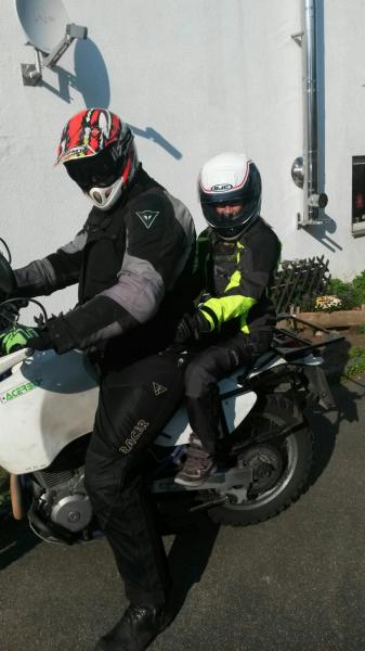 Aus mehr oder weniger aktuellem Anlass die Bildliche Dokumentation jeweils kurz vor dem Beginn der Jungfernfahrt. Das sind tatsächlich 2 unterschiedliche Kinder, trotz dass die ein wenig mehr als ein Jahr auseinander sind passen sie in die selben Klamotten. Selbst der Helm passt beiden. Wir haben uns in der Heilbronner Motorradecke intensiv beraten lassen und haben darauf geachtet dass die Protektoren an der richtigen Stelle sitzen. Und die Kids sind begeistert. Macht auch Laune mit denen zu fahren, die merkt man fast nicht hintendrauf. Bei meinem Lebendgewicht fällt das nicht auf.