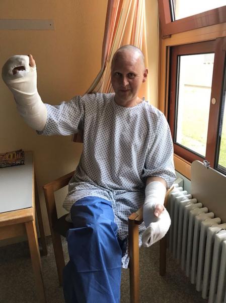 Ich hatte vor vier Wochen einen Explosionsunfall auf der Arbeit, wobei ich mir mehrere offene Brüche an der linken Hand, sowie schwere Verbrennungen am rechten Arm zugezogen habe.