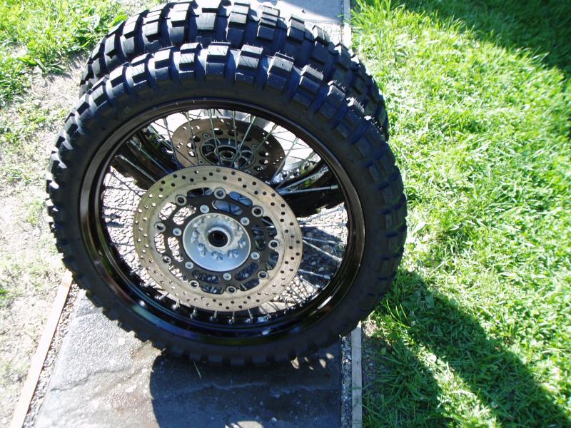 da ich günstig rangekommen bin und demnächst in Slowenien rumfahren kann hab ich TÜV gerechte Reifen auf die XF felgen gezogen vorne TK 80 hinten Mitas E09....