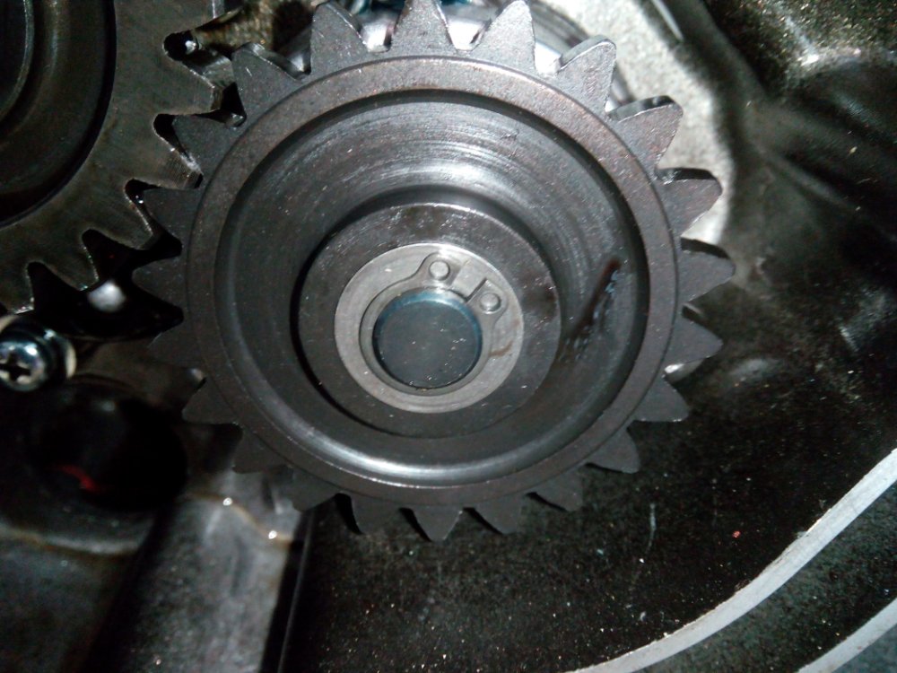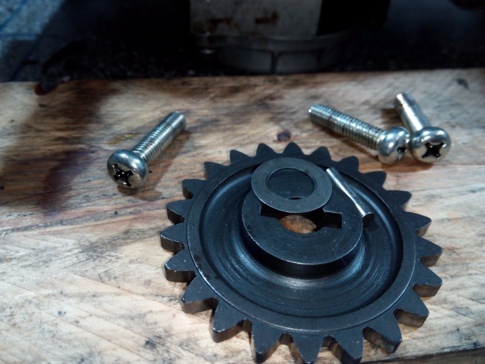 Zahnrad, Bolzen, Unterlegsscheibe und Seegerring (aber richtig herum!)