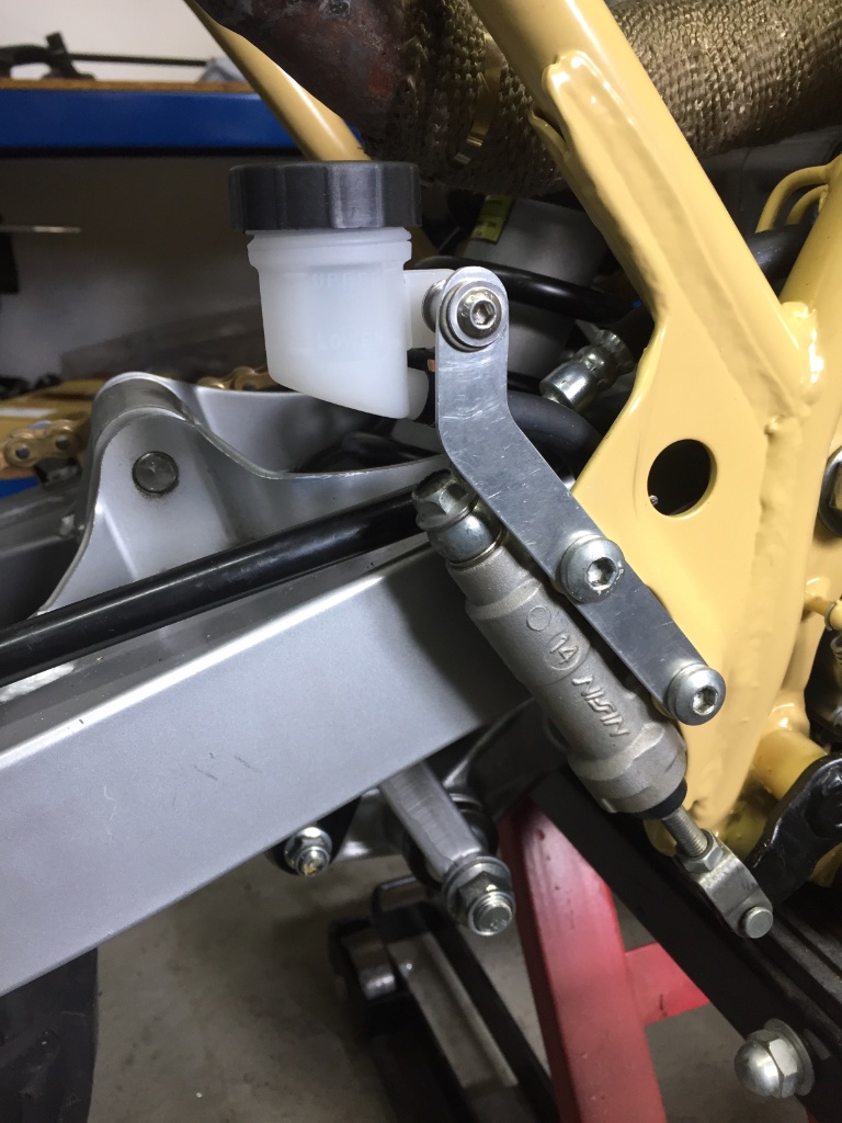 Um das Schloss etwas zu kaschieren habe ich der DR noch ein kleines Schild angebaut. Der Bremsflüssigkeitsbehälter musst noch aus dem Rahmendreieck ... also habe ich ihn kurz oberhalb des Hautzylinders angebaut. Im Bild ist noch die Alu-Variante die noch durch ein VA-Blech ersetzt wird ... ist stabiler ...