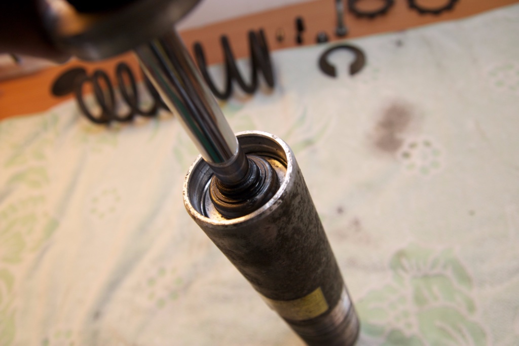 Man kann es in der Tat auch komplett zerlegen. Wie in den üblichen Anleitungen auf Youtube schlägt man dazu vorsichtig die Abdeckkappe runter (man muss dazu in der kleinen Öffnung ansetzen), Führungshülse in den Dämpfer reindrücken Sicherungsring herausnehmen. Dann kann man alles herausziehen. Vorher den Restdruck ablassen oben am Ventil!