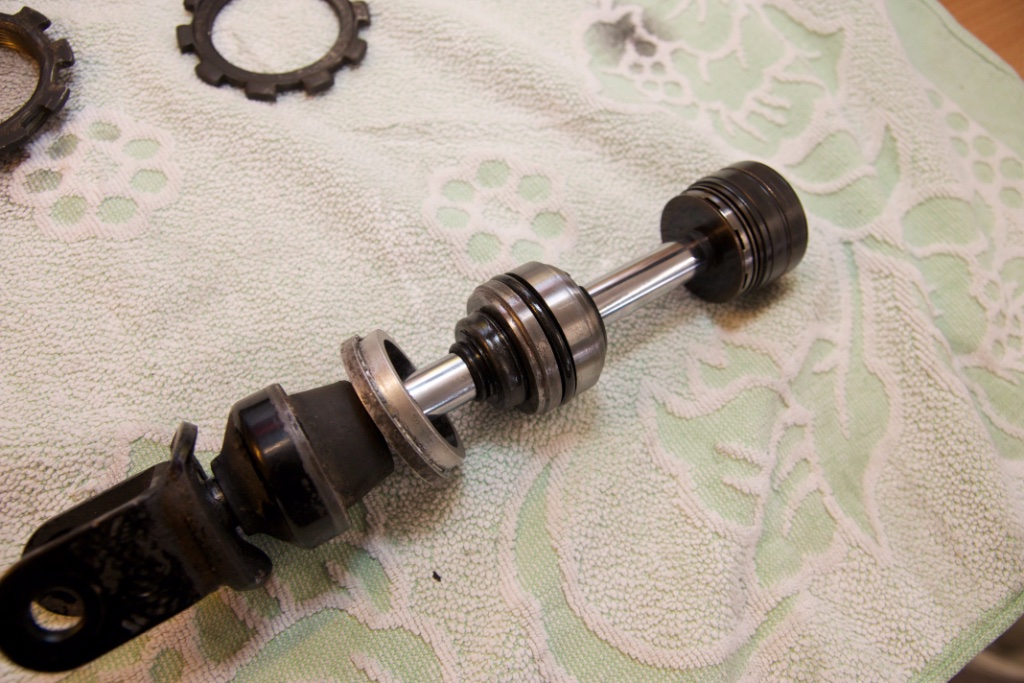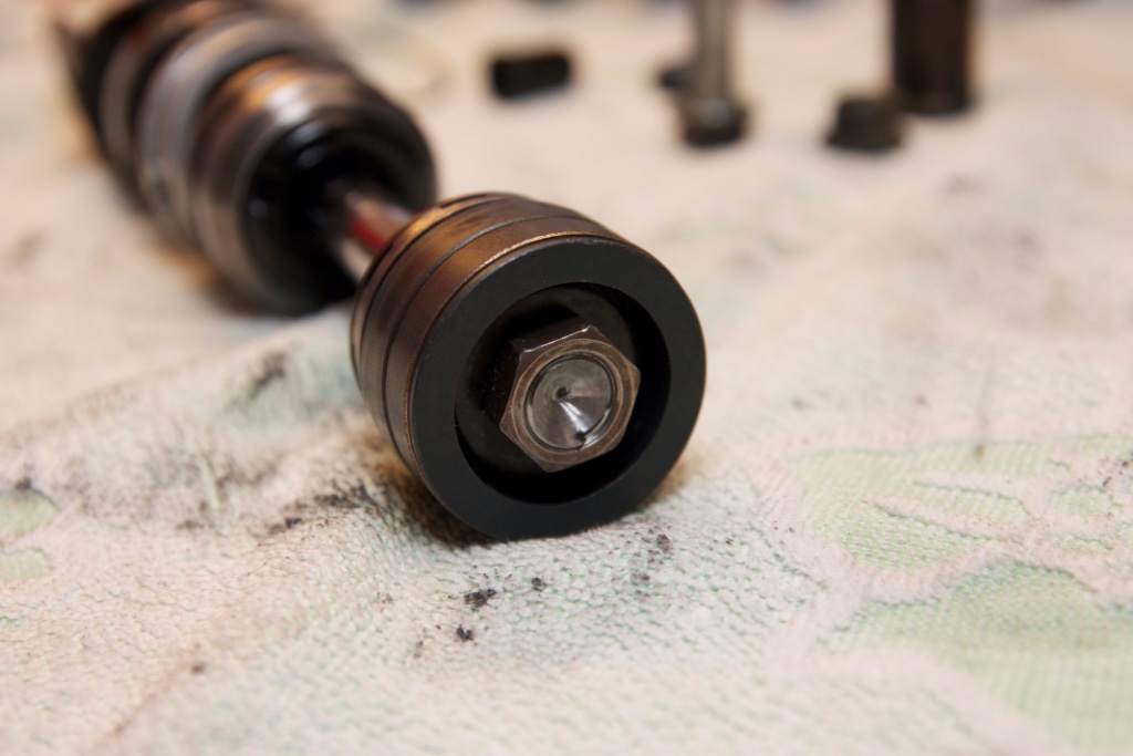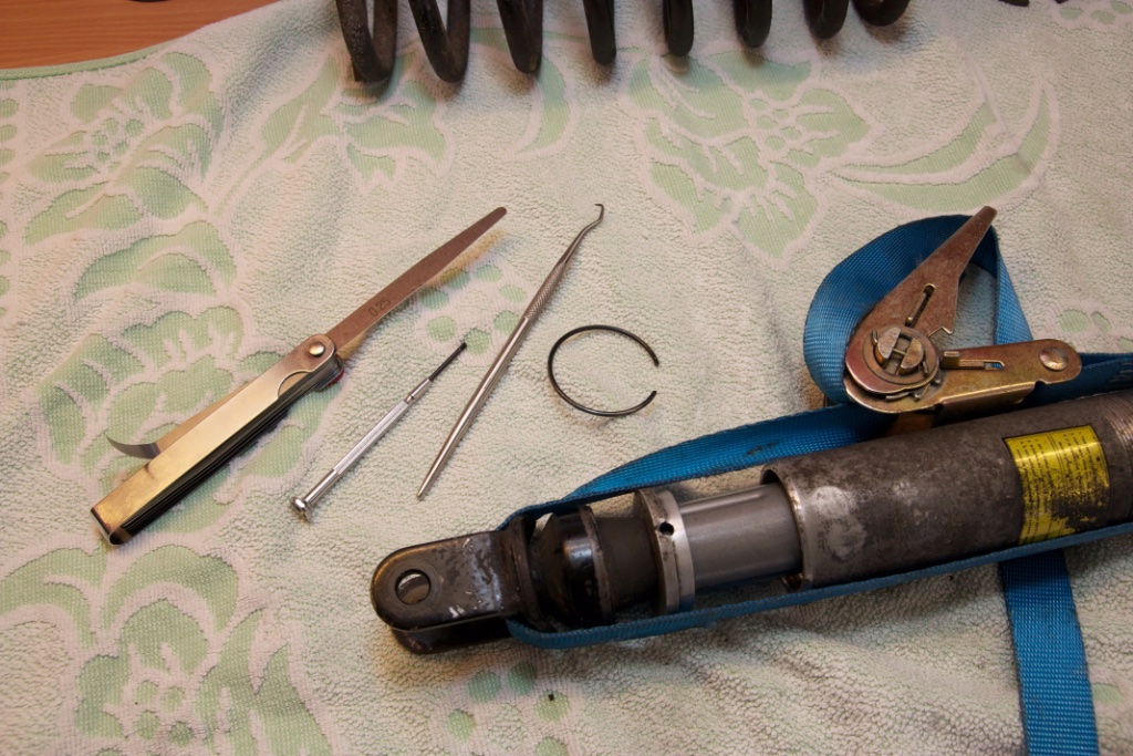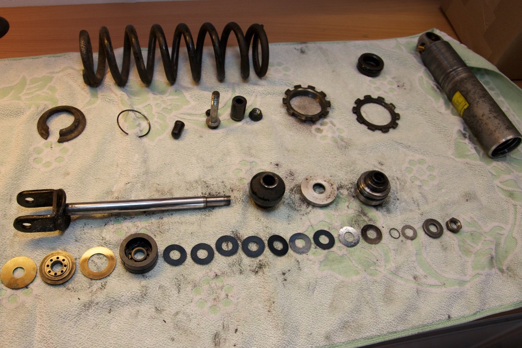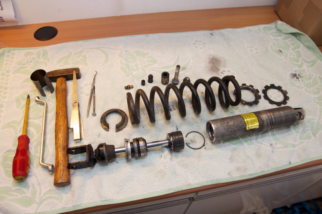 Man kann es in der Tat auch komplett zerlegen. Wie in den üblichen Anleitungen auf Youtube schlägt man dazu vorsichtig die Abdeckkappe runter (man muss dazu in der kleinen Öffnung ansetzen), Führungshülse in den Dämpfer reindrücken Sicherungsring herausnehmen. Dann kann man alles herausziehen. Vorher den Restdruck ablassen oben am Ventil!