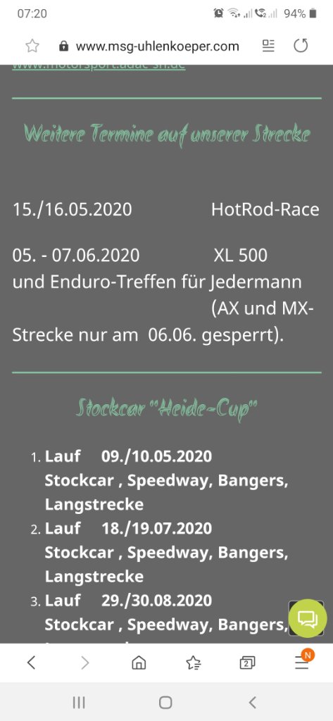 http://www.mcs-schrecksbach.de/mcs-schr ... rmine.html auch sehr geil, das Enduro-Cross-Camp im August ist echt Klasse und immer sehr gut besucht, Zeltwiese und so. Programm ist was mann mag, abwechselnd fahren die Crosser, dann kann jedermann, tolles Gelände, teilweise sehr steil bergauf und ab.