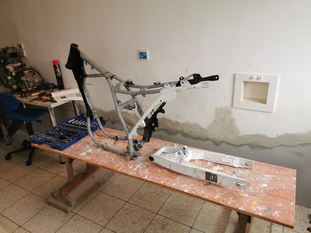 einmal komplett zerlegt. Rahmen und Schwinge gehen jetzt erstmal zum Sandstrahlen und werden dann lackiert/pulverbeschichtet. Wenn ich schonmal dabei bin... :lol: :lol: :lol: