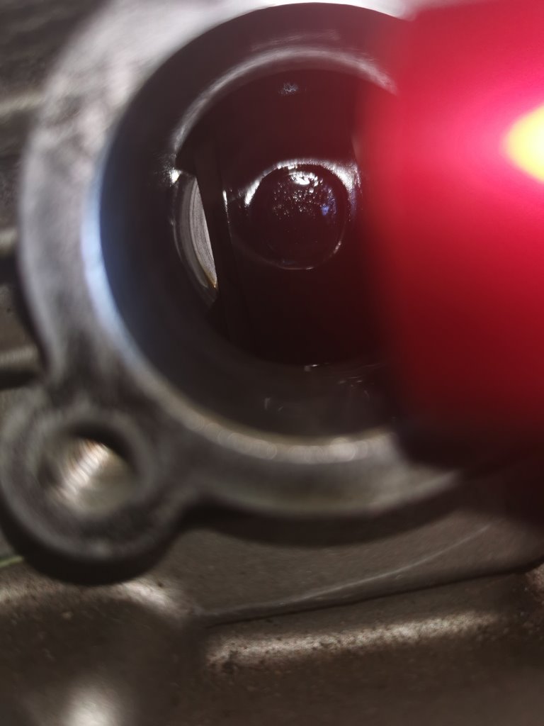 Ich glaube ich habe damals, als ich den Motor auseinander genommen habe (etwa 3k Kilometer her) die Führungsschienen vergessen habe. Nachdem ich kurz vor Fertigstellung gesehen habe, dass die Schienen noch auf der Werkbank lagen, habe ich diese kurzerhand eingebaut aber vergessen das Prozedere mit dem Spanner zu wiederholen. Heißt, ich habe den Spanner anscheinend, voll ausgefahren, verschraubt. Das erklärt diese Grube in der Schiene. Oder hat die das immer? Habe mal ein etwas deutlicheres Bild hochgeladen. Man sieht hier durch das "Spanner-Loch" :lol: :lol: :lol:
